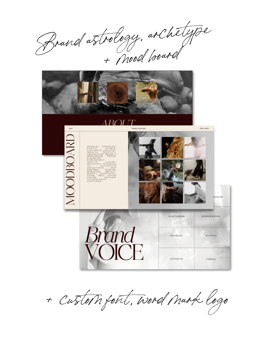 Using her key 3 brand astrology placements for magnetic messaging, visuals and voice, Emily developed Zoeys’s Brand Guidelines, complete with fonts, colours, a curated stock imagery collection and more.